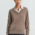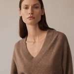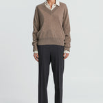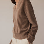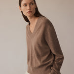 This v-neck cashmere sweater is soft and comfortable, blending style with coziness. Made from luxurious cashmere, it features a deep v-neck, long sleeves, and ribbed edges on the neckline, hem, and cuffs. Pair it with smooth silk for a relaxed but polished outfit, or layer it over a shirt or tee for added style.