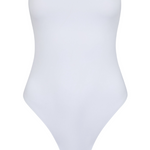 INNES LAUREN Strapless One Piece is crafted from recycled Italian fabric ECONYL® in a soft matte sophisticated white. This fabric is crafted from regenerated fishing nets.